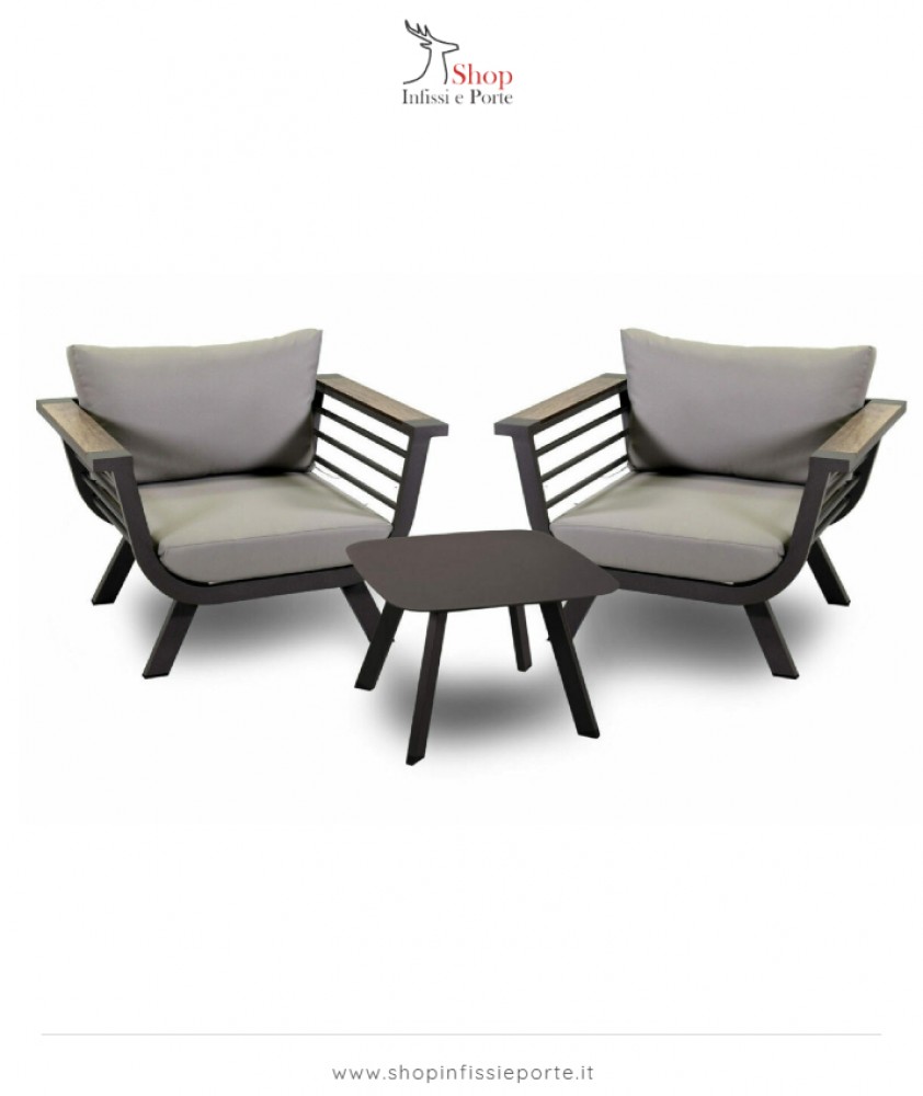 Home » Arredamento Casa » Salotti da giardino » Salotto imbottito composto da 2 poltrone in alluminio con schienale basso e braccioli con inserti HPL e tavolino quadrato