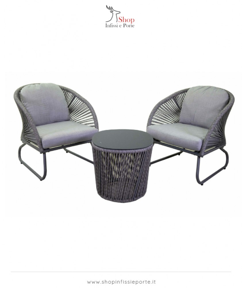 Salotto imbottito composto da 2 poltrone in alluminio e corda intrecciata in poliestere e tavolino tondo con piano in vetro