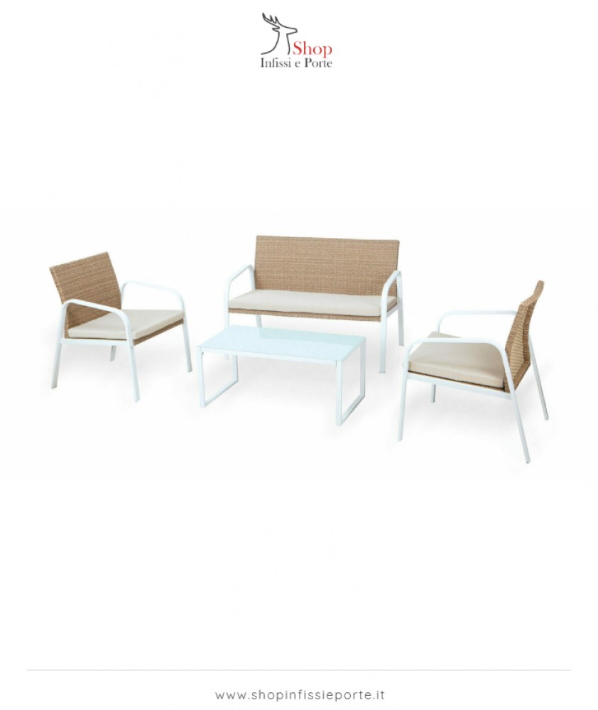 Struttura in acciaio verniciato con vernici epossidiche di colore bianco, rivestimento in polyrattan miele completo di cuscini color beige.