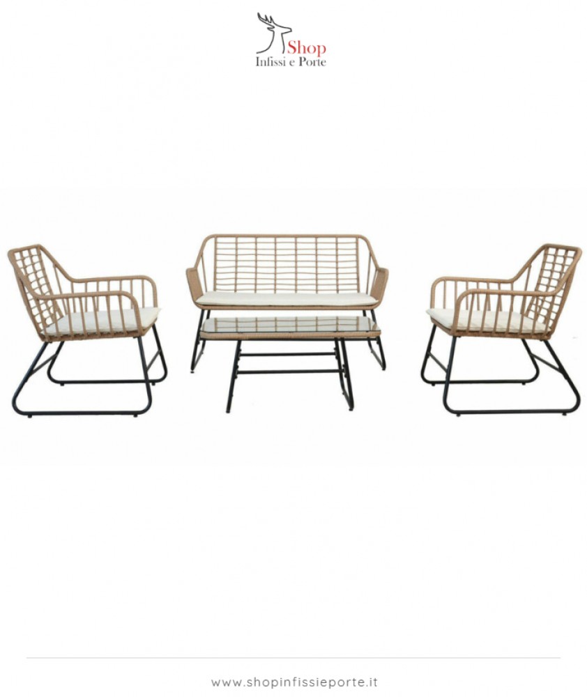 Salotto imbottito sulla seduta composto da divano 2 posti con 2 poltrone in acciaio e polyrattan e tavolino rettangolare con piano in vetro
