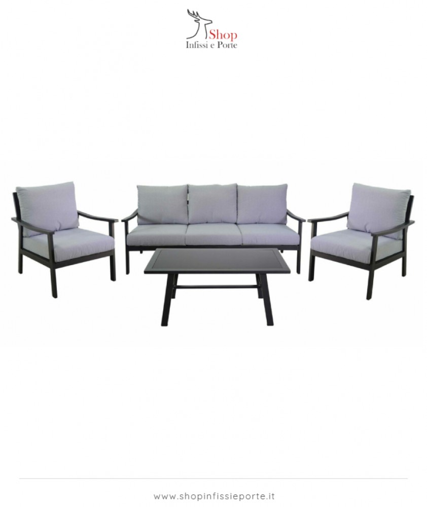 Salotto imbottito composto da divano 3 posti con 2 poltrone in alluminio e tavolino rettangolare con piano a contrasto in vetro