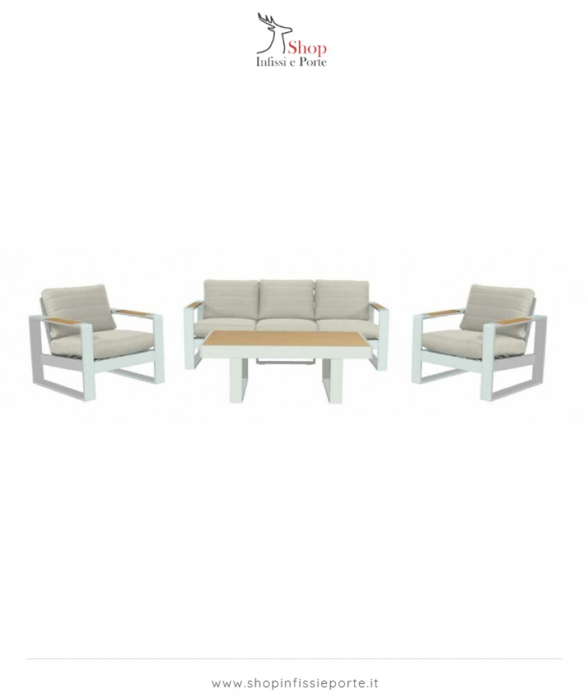 Salotto imbottito composto da divano 3 posti con 2 poltrone in alluminio e tavolino rettangolare con inserti in polywood
