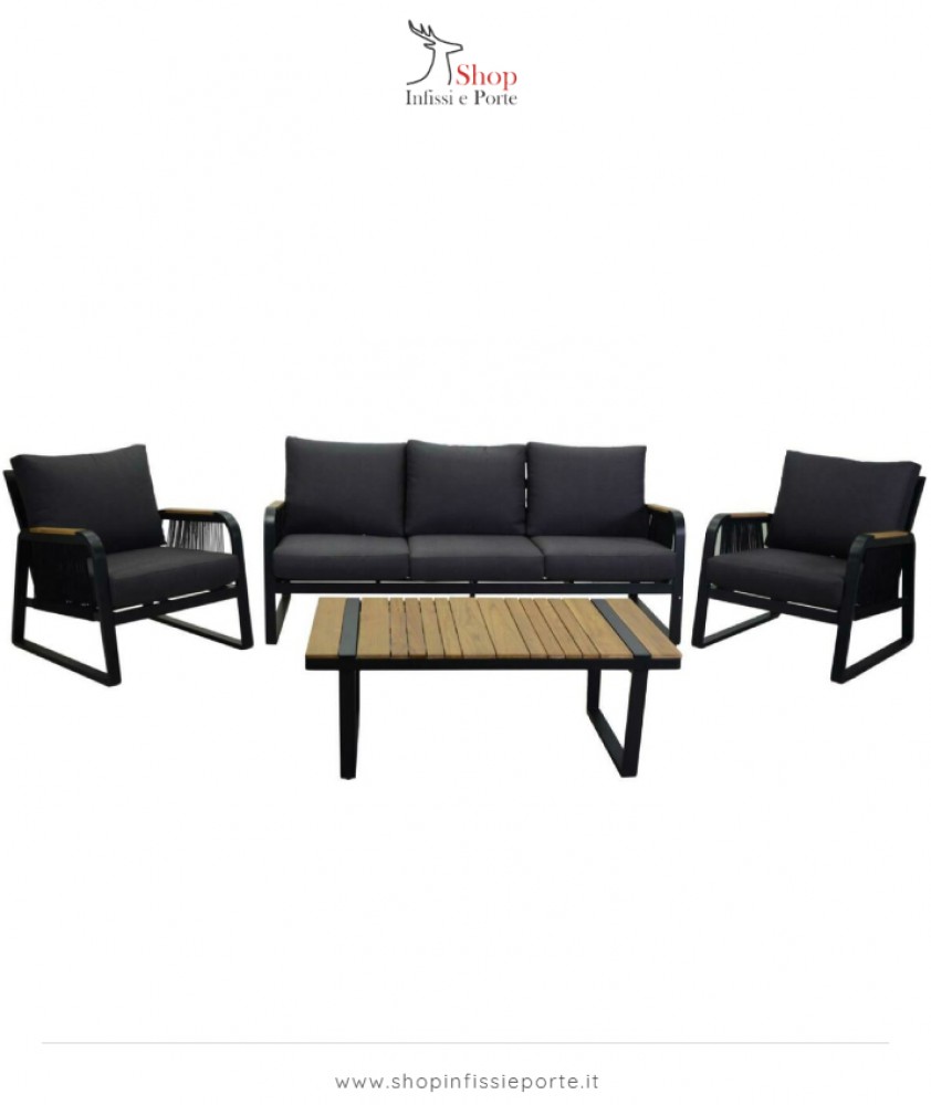 Home » Arredamento Casa » Salotti da giardino » Salotto imbottito composto da divano 3 posti con 2 poltrone in alluminio con braccioli con riporti in teak e finiture in corda e tavolino rettangolare con piano in teak