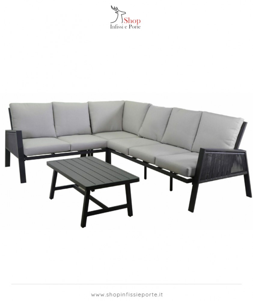 Salotto imbottito composto da divano angolare 3+2 posti in alluminio e tavolino rettangolare