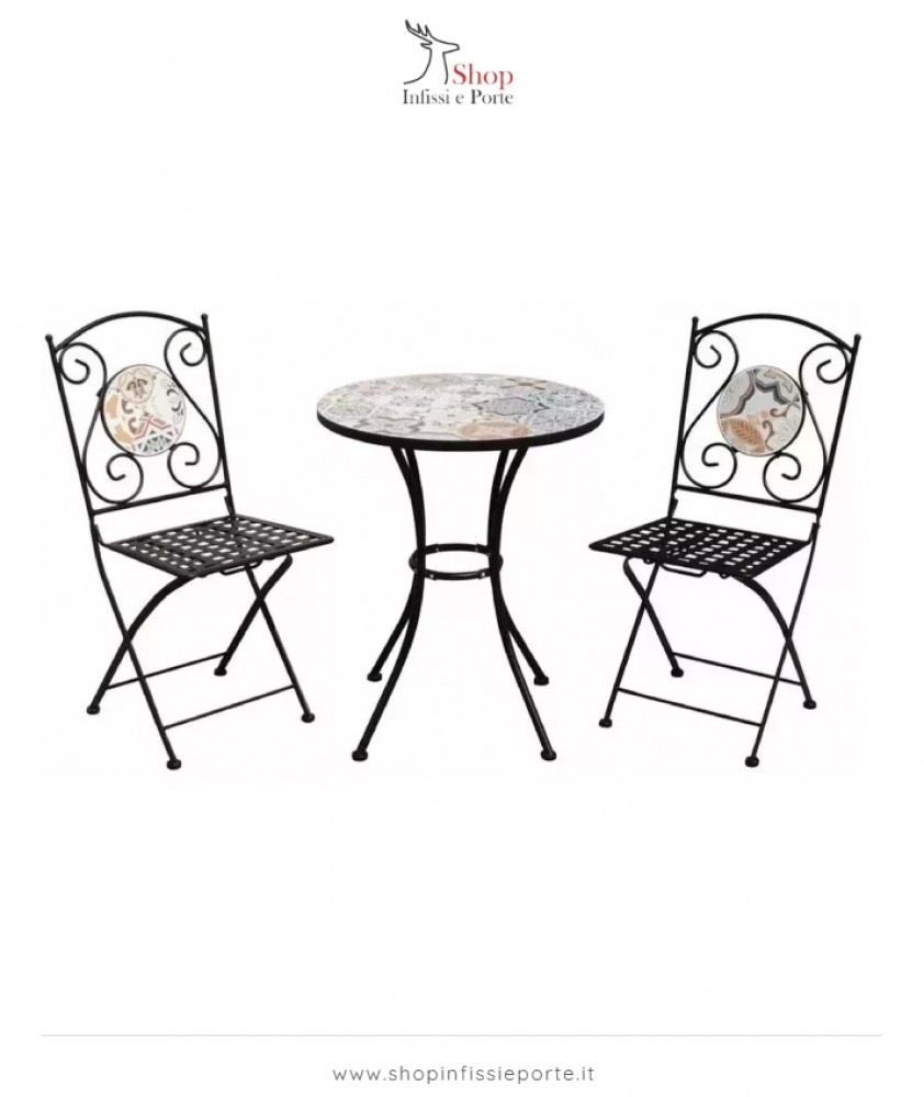 Tavolino circolare in acciaio decorato con stampa a maioliche siciliane e 2 sedie pieghevoli