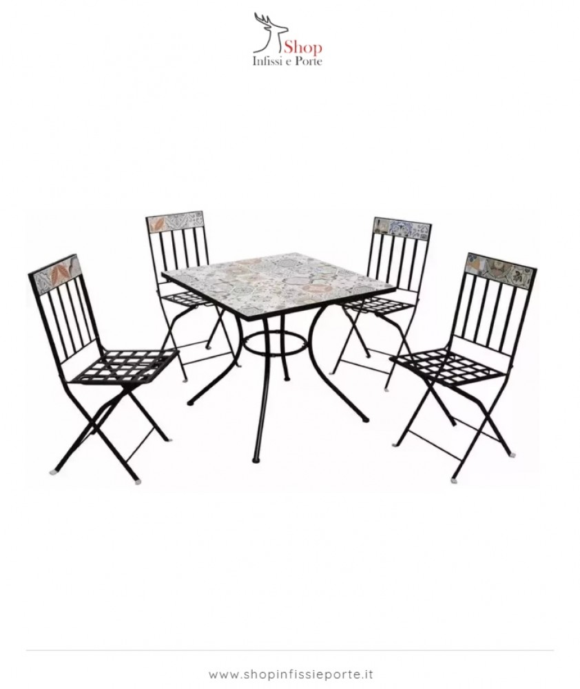 Tavolino quadrato in acciaio decorato con stampa a maioliche siciliane e 4 sedie pieghevoli