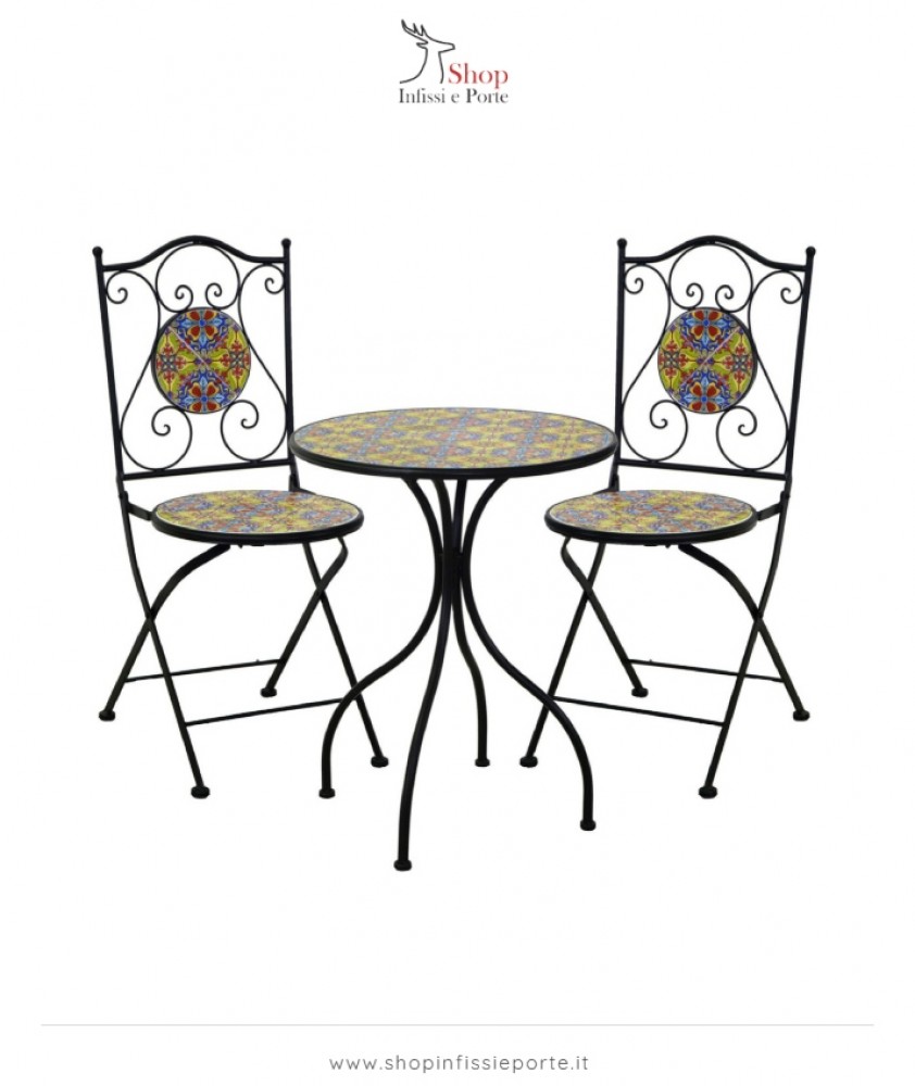 Tavolino circolare in acciaio e 2 sedie decorati con stampa