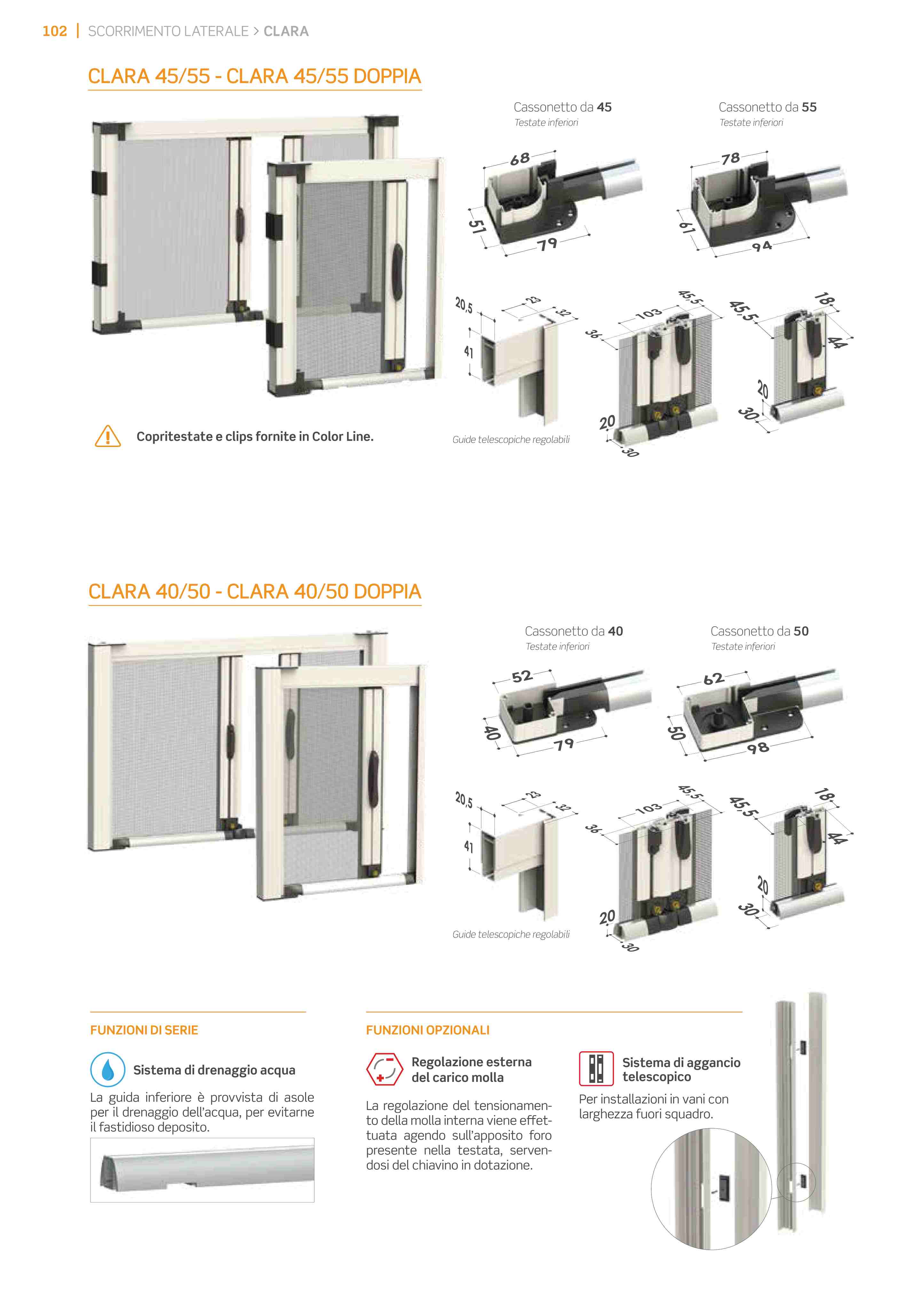 Clara è una zanzariera laterale avvolgibile a molla per portefinestre, con bottoncino; caratterizzata da guida bassa e spigoli arrotondati nonchè da guide telescopiche superiori; è adeguata per l'installazione in vani irregolari