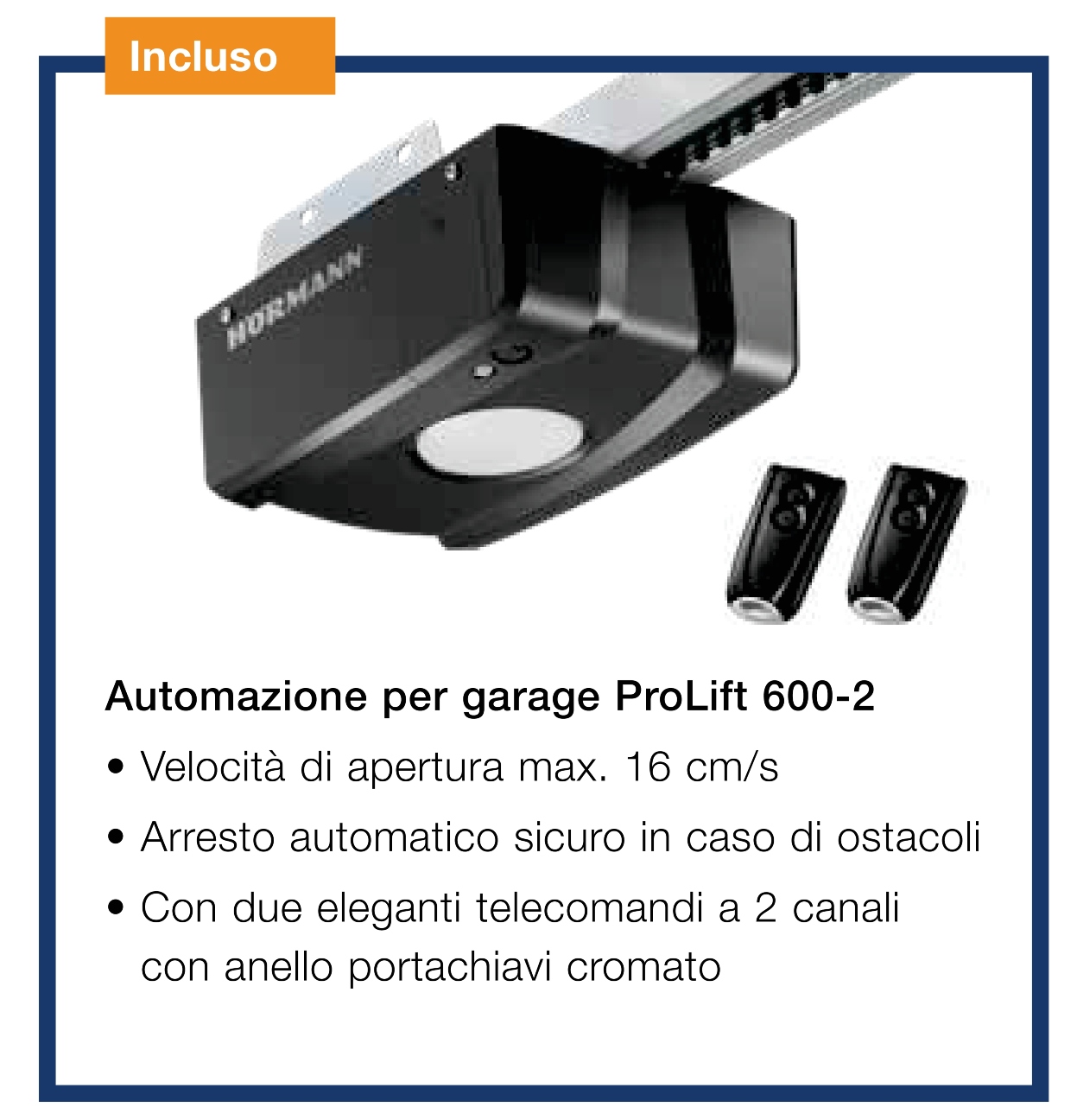 • ​Motorizzazione per garage ProLift 600-2 inclusa di serie con 2 telecomandi a 2 canali, funzione soft-start, sistema radio a 433 MHz
